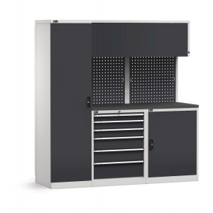 Die komplette Werkstatteinrichtung besteht aus einer Reihe von Möbelkombinationen, die im Laufe der Zeit ergänzt werden können und entwickelt wurden, um die unterschiedlichen Anforderungen von Motorrad- und Automechanikern sowie Heimwerkern zu erfüllen. Es können lineare Lösungen oder Ecklösungen sein, die durch die Kombination von Elementen realisiert werden, die in keinem Reparaturbereich fehlen dürfen: Werkbank für Garage, Werkstattwagen, Eisenschrank und Schubladenschrank werden miteinander kombiniert, um die Einteilung des gesamten Arbeitsmaterials und dessen Auffinden einfacher zu gestalten und zu beschleunigen.
