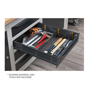 Work Up ist die höhenverstellbare Werkbank mit einem Wandsystem mit Platten mit 10 x 10 mm großen Löchern im oberen Teil und einem Schrank mit 4 Schubladen, einem Schrank mit Tür und einem Halbboden im unteren Teil. Alle Lösungen in dieser Werkbank wurden entwickelt, um die Arbeit besser organisiert und effizienter zu gestalten, weil die Möglichkeit besteht, spezifische Bereiche für die Aufbewahrung von bestimmten Werkzeugen, Geräten oder Komponenten vorzusehen. Die Schränke sind mit Zylinderschlössern ausgestattet, um das Material sicher aufbewahren zu können.